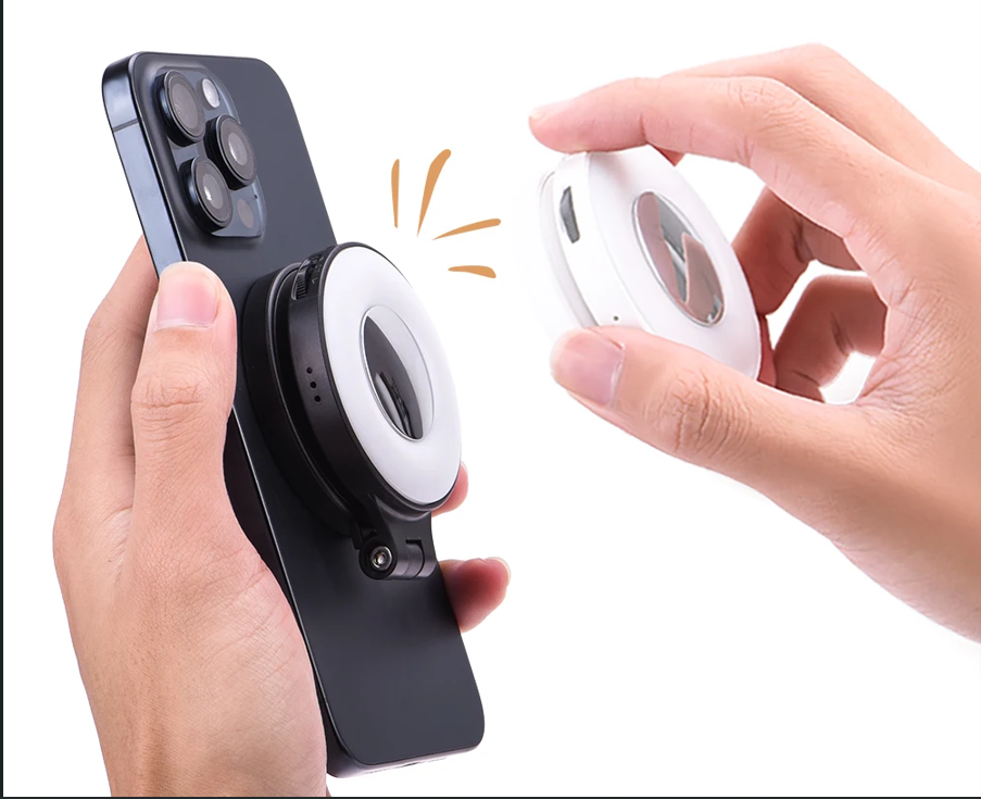 Upgrade your selfies and videos with this compact LED ring light. 🌟 Attaches magnetically to any MagSafe phone for quick setup, and the built-in mirror 🪞 helps you check your angles. The 180° foldable design 🔄 gives flexible lighting, while its lightweight, portable build 👜 makes it perfect for on-the-go use. Bright, even illumination 💡 ensures every shot looks professional.